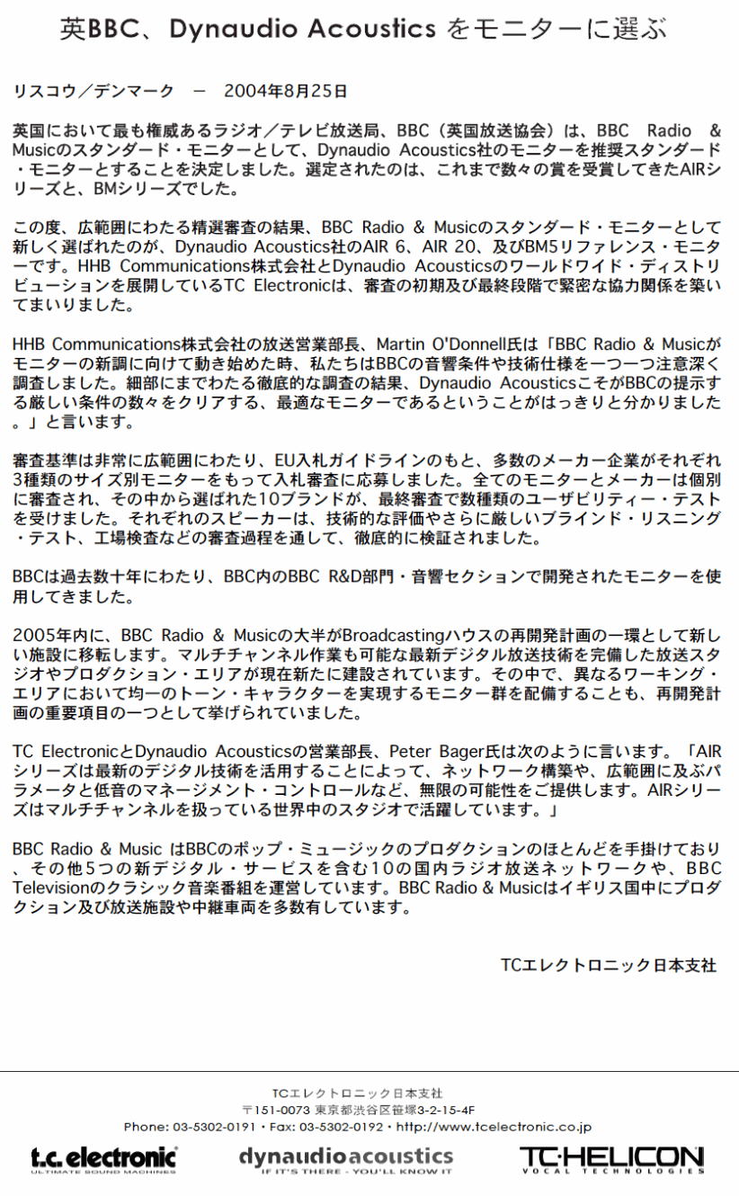 英国において最も権威あるラジオ/テレビ放送局、BBCは、BBC Radio&Musicのスタンダード・モニターとして、Dynaudio Aoustics社のモニターを推奨スタンダード・モニターとすることを決定しました!